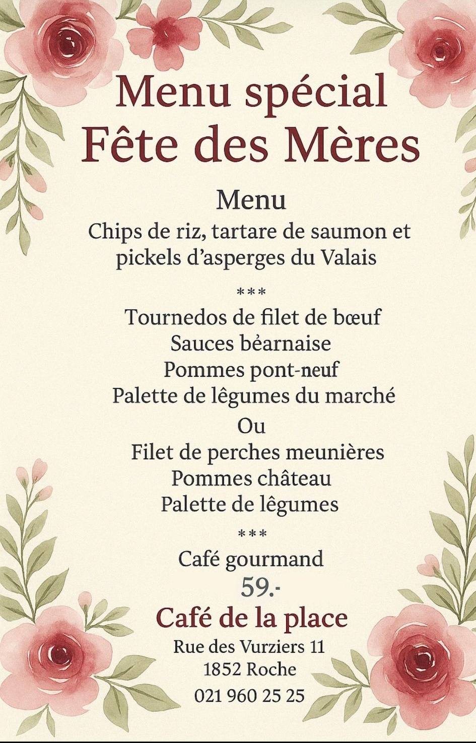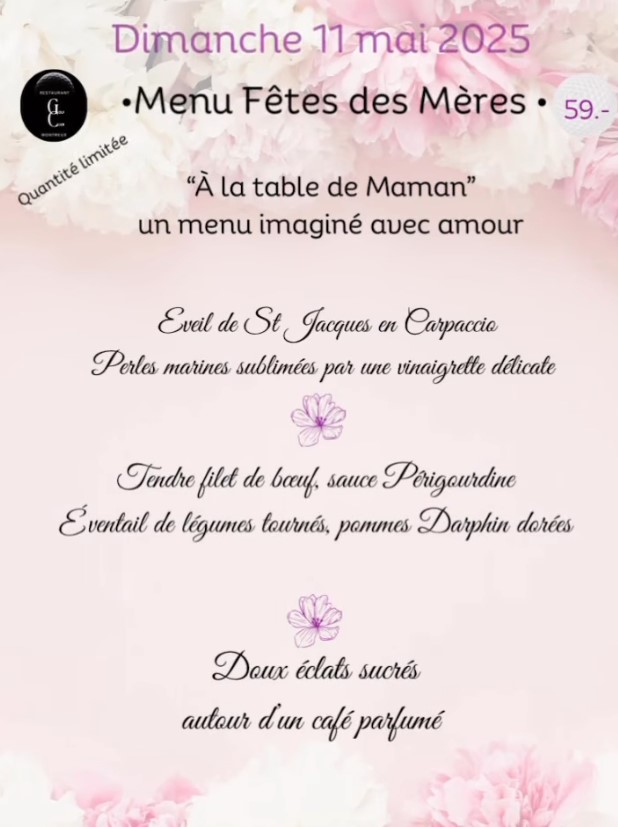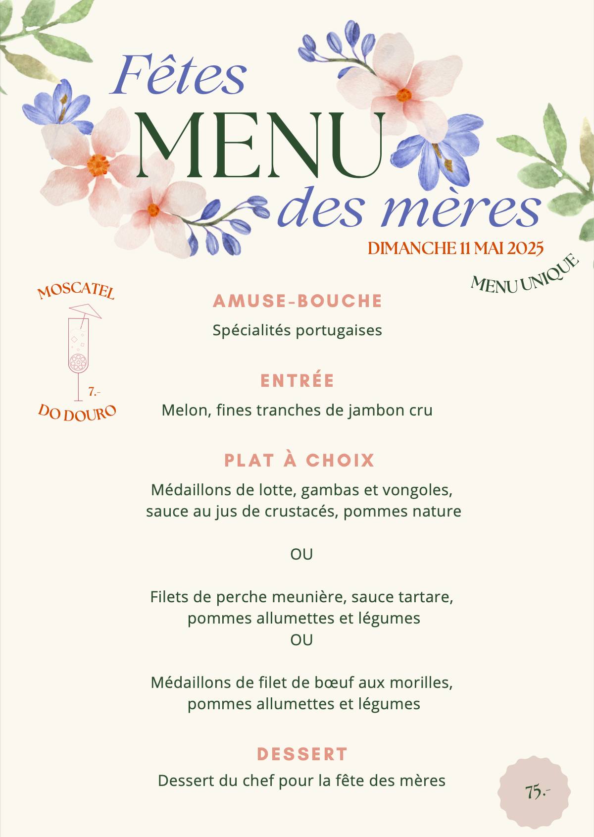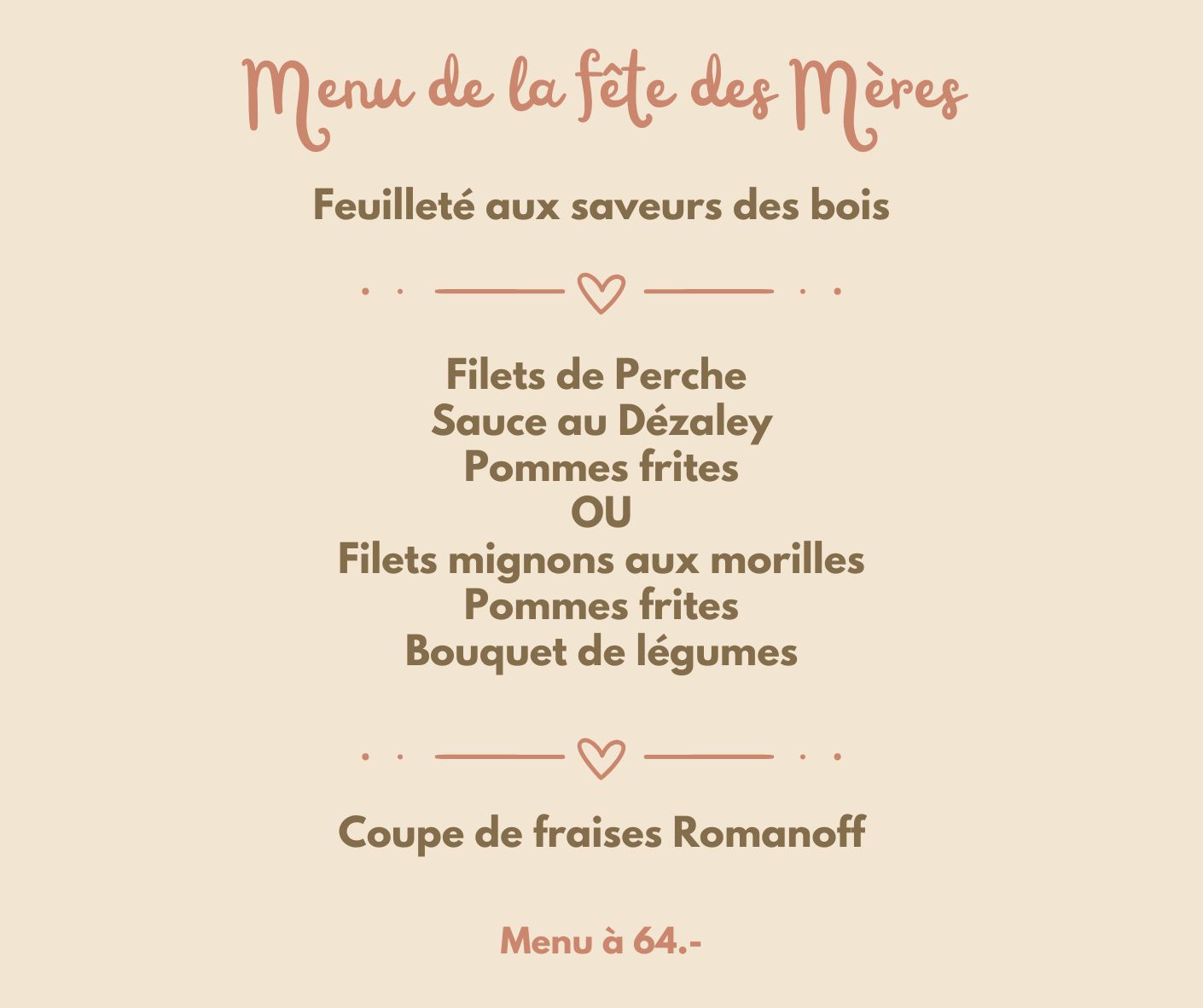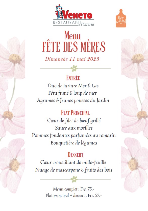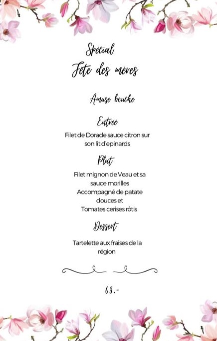 Menus spéciaux de la Fête des Mères 💐 sur GoLunch Retrouvez tous les menus de la Fête des Mères 2025 des restaurants proches de chez-vous sur notre application de menus du jour . Nous recensons actuellement 125 menus pour la Fête des Mères en Suisse romande, Vaud, Valais, Genève, Fribourg pour un prix moyen de CHF 66.- par personne.