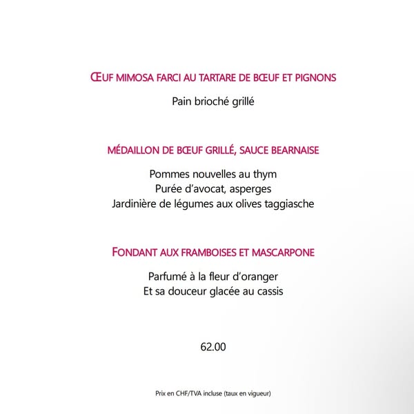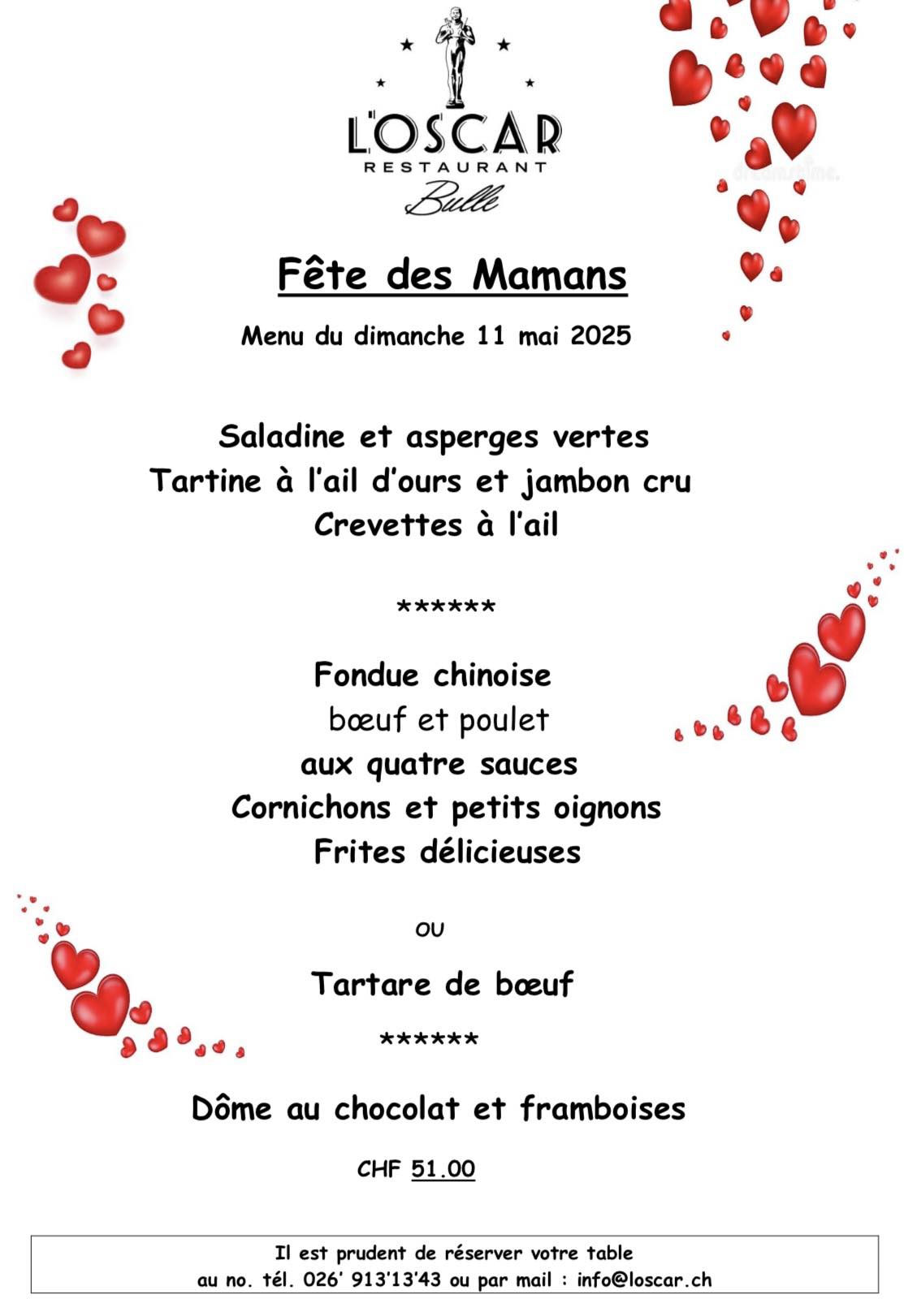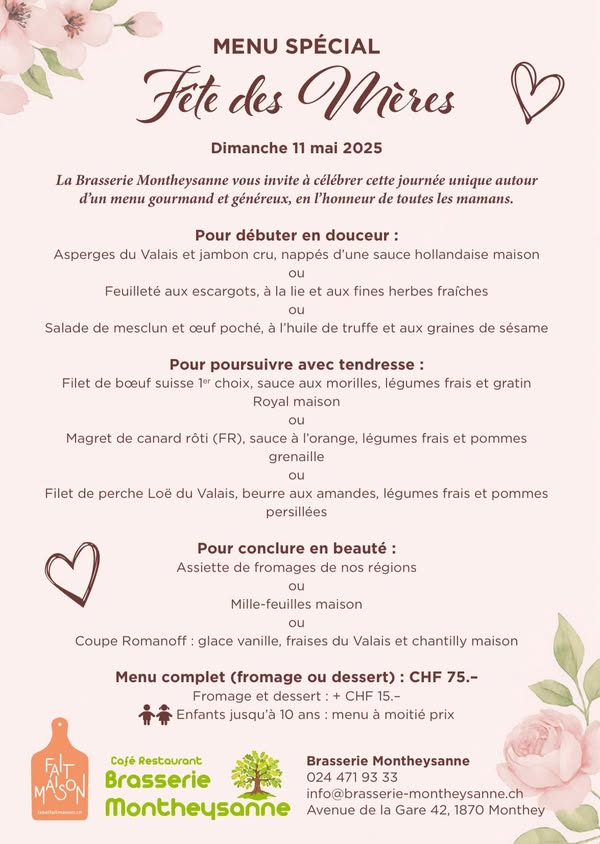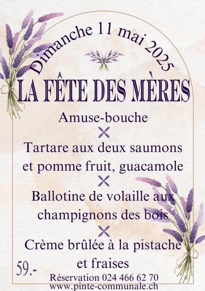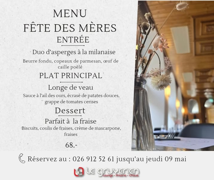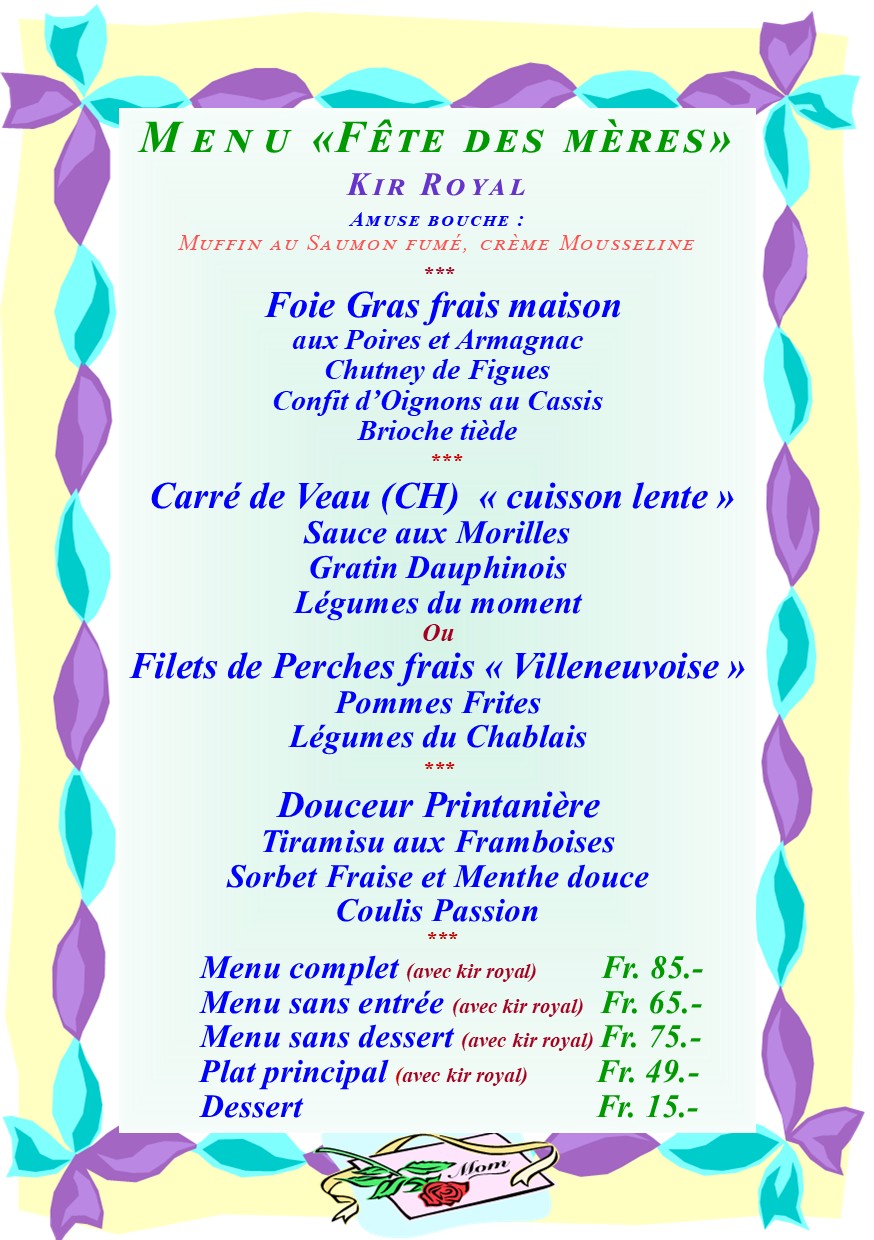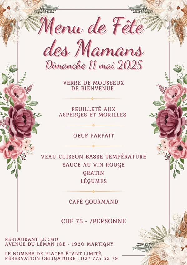 Menus spéciaux de la Fête des Mères 💐 sur GoLunch Retrouvez tous les menus de la Fête des Mères 2025 des restaurants proches de chez-vous sur notre application de menus du jour . Nous recensons actuellement 125 menus pour la Fête des Mères en Suisse romande, Vaud, Valais, Genève, Fribourg pour un prix moyen de CHF 66.- par personne.
