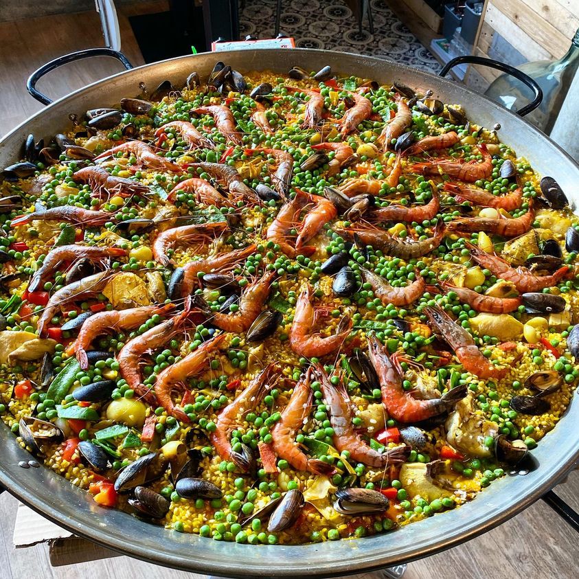 Paella du chef avec calamars , poulet, gambas , chorizo, moules quelques légumes et le bon riz bien entendu