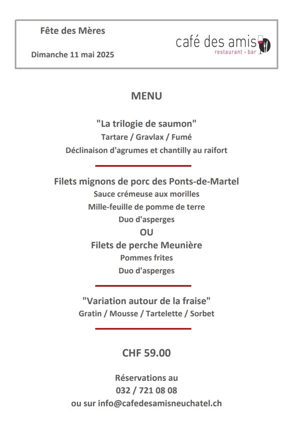 Le restaurant Café des Amis à Neuchâtel propose toute la semaine et samedi un menu du jour à 19 CHF avec entrée ou un plat à la carte.