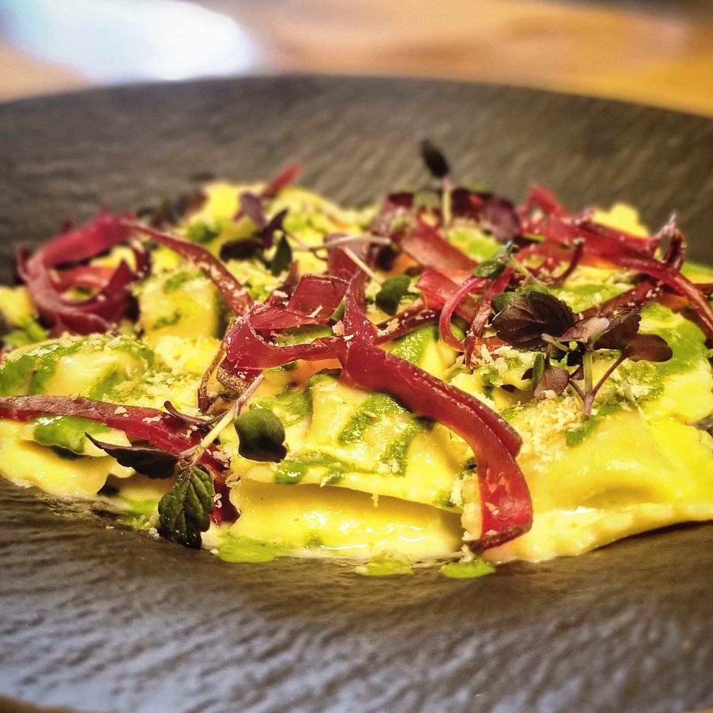 Raviole à l'ail des ours, crème de parmesan, coulis de persil, viande des Grisons